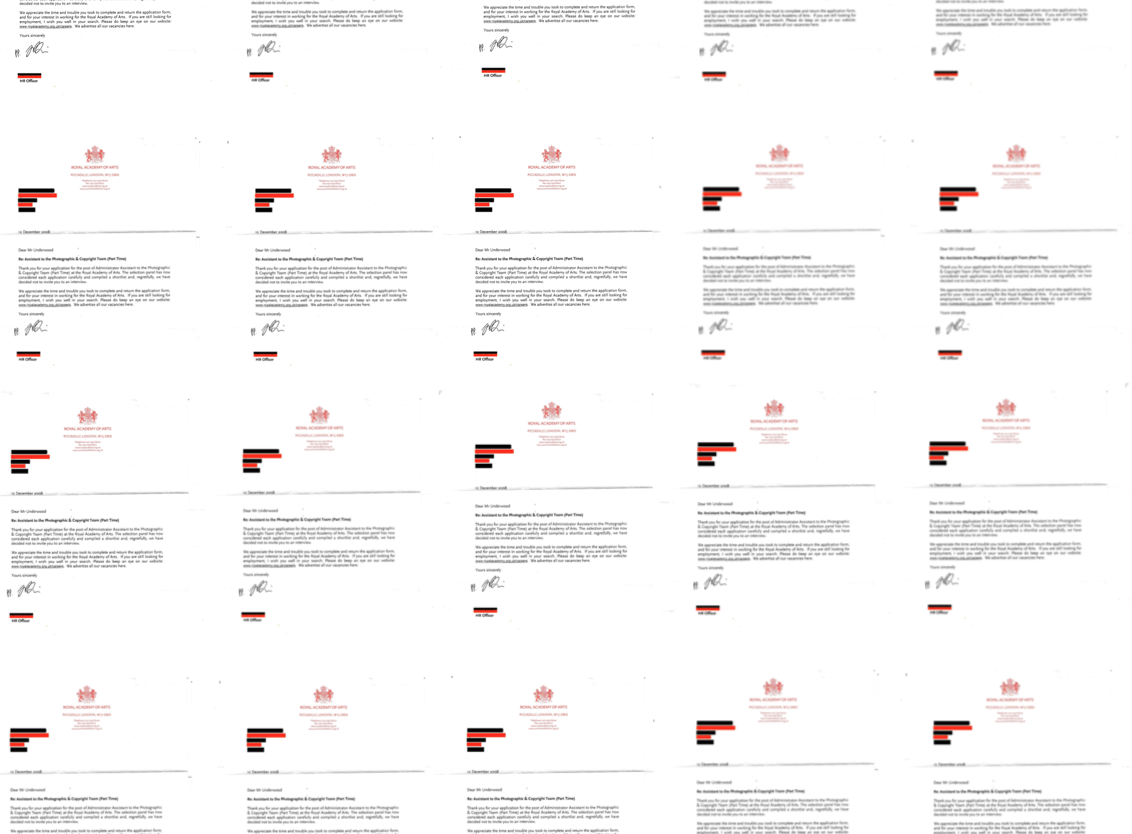 Lettre de Refus Quatre (2008, with redaction, after Daniel Buren); Art Institution for Art Institution’s Sake Series; Wallpaper / Bed (2013), GCGCA(i)